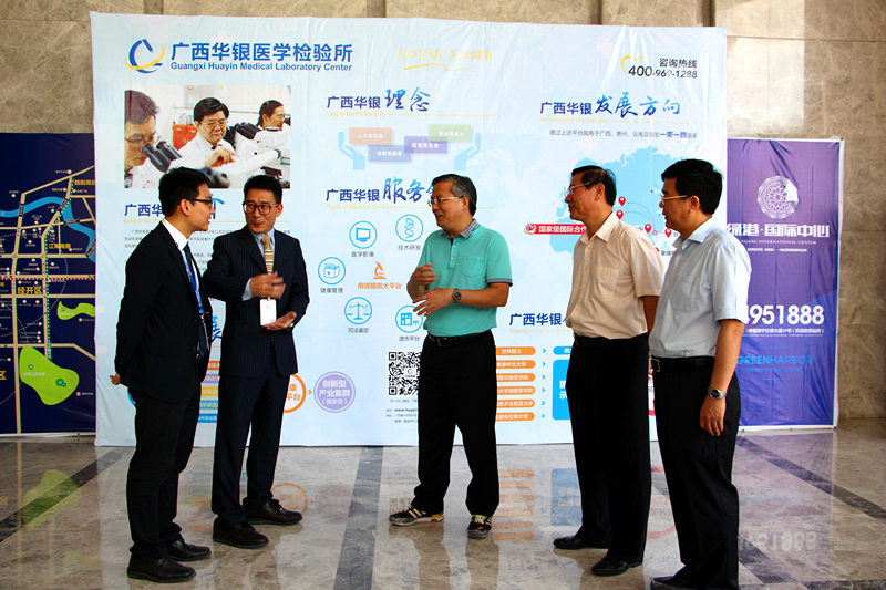 周紅波市長(中)視察位于綠港國際中心B4棟的廣西華銀醫(yī)學檢驗所,與企業(yè)負責人親切交談