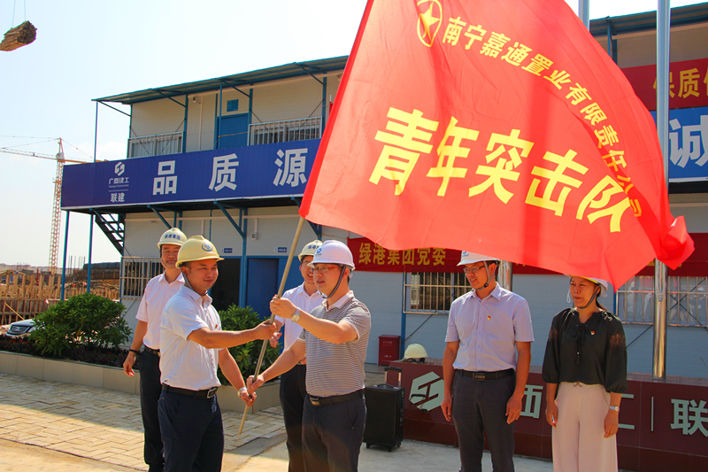 在授旗儀式中,集團(tuán)黨委書記、董事長、總經(jīng)理龔國強(qiáng)對南寧科技產(chǎn)業(yè)園項目人員前期所做出的工作給予了充分肯定,贊揚了黨員先鋒隊員、青年突擊隊員和工人朋友們?yōu)轫椖拷ㄔO(shè)所付出的艱苦和努力,當(dāng)前項目進(jìn)展取得了較好的成績。自8月12日南寧科技產(chǎn)業(yè)園項目正式開工以來,嘉通公司黨支部帶領(lǐng)工人們?nèi)找箍喔桑Х桨儆嬁朔毫拥呐_風(fēng)天氣等不利因素,在短短的2個月時間便完成1#樓廠房一層的搭設(shè)模板,2#、3#樓回填基礎(chǔ)土方,4#樓防水保護(hù)層澆筑以及9#宿舍樓基礎(chǔ)承臺澆筑等工作,充分展現(xiàn)了綠港鐵軍風(fēng)采。下一步,希望全體黨員先鋒隊、青年突擊隊隊員們以此次授旗為契機(jī),繼續(xù)發(fā)揚綠港鐵軍精神,創(chuàng)先爭優(yōu),攻堅克難,加快推進(jìn)項目建設(shè),確保項目如期建成交付。