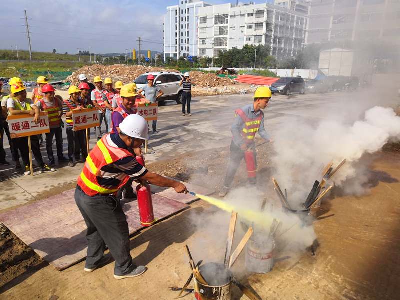 激烈的比賽結束后,消防應急演練活動開始了。當聽到“起火啦”的大喊聲,全體人員井然有序的進行了逃生演習。伴隨著濃濃的煙霧,每個人捂著“濕毛巾”,沿著樓梯靠右一個接一個的快速撤離。當全體人員走出廠房大門時,工作人員在空地上點燃了幾盆火焰。公司質(zhì)安部負責人講解了干粉滅火器的使用方法后,大家進行了踴躍的嘗試。在此次消防演習中,本著防患于未然的心態(tài),所有人員積極參與,專心聽講,既鞏固了消防安全知識,也提高了項目安全生產(chǎn)工作水平。