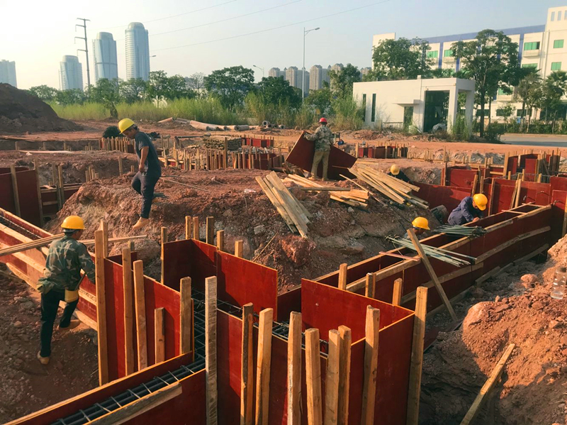 瑞聲南寧光學(xué)項(xiàng)目主產(chǎn)高精密手機(jī)鏡頭,包括一體式VCM雙攝、晶圓級(jí)玻璃(WLG)鏡頭、玻塑混合鏡頭等,是瑞聲核心技術(shù)之一,項(xiàng)目的盡快投產(chǎn)對(duì)于瑞聲公司在美國(guó)打壓中國(guó)通訊產(chǎn)業(yè)的大環(huán)境下?lián)屨籍a(chǎn)業(yè)鏈轉(zhuǎn)移先機(jī),搶占市場(chǎng)份額;經(jīng)開(kāi)區(qū)落實(shí)自治區(qū)強(qiáng)首府戰(zhàn)略、打造千億產(chǎn)業(yè)園等都有著十分重要的意義,是一個(gè)多贏格局。項(xiàng)目計(jì)劃2020年2月上旬正式投產(chǎn)。榮鑫公司在該項(xiàng)目中主要承擔(dān)附屬工程施工,包括設(shè)備用房、污水處理廠房、危品庫(kù)、空壓機(jī)房主體施工及園區(qū)道路、綠化等,是名符其實(shí)的配角,但在項(xiàng)目的前期階段,聚光燈卻始終照在這“配角”的身上。附屬工程中,設(shè)備用房、污水處理廠房等建筑面積共4000平方米,是項(xiàng)目裝修、安裝的基礎(chǔ)工程,投產(chǎn)倒排工期要求2019年12月25日前必須完成并交付安裝單位(道路綠化等配合項(xiàng)目總進(jìn)度,不在此列),工期不足三個(gè)月!該部分用房面積雖不大,且大部分只有兩層,但由于特殊設(shè)計(jì)要求且項(xiàng)目處回填區(qū)域,涉及樁基、深基坑(5.5米)、高支模(8.3米)、防滲防腐等土建施工難點(diǎn)、費(fèi)時(shí)點(diǎn),不可控因素多,給工程按期完工帶來(lái)了極大的困難。該部分項(xiàng)目工程量不大,與后期裝修、安裝關(guān)系密切,本應(yīng)由裝修總包單位統(tǒng)一施工,但裝修單位一再推托,坦言不可能完成。最終管委將此部分項(xiàng)目授與了榮鑫公司。此時(shí),裝修、安裝單位在觀望,業(yè)主、建設(shè)主管部門也都在捏把汗。
