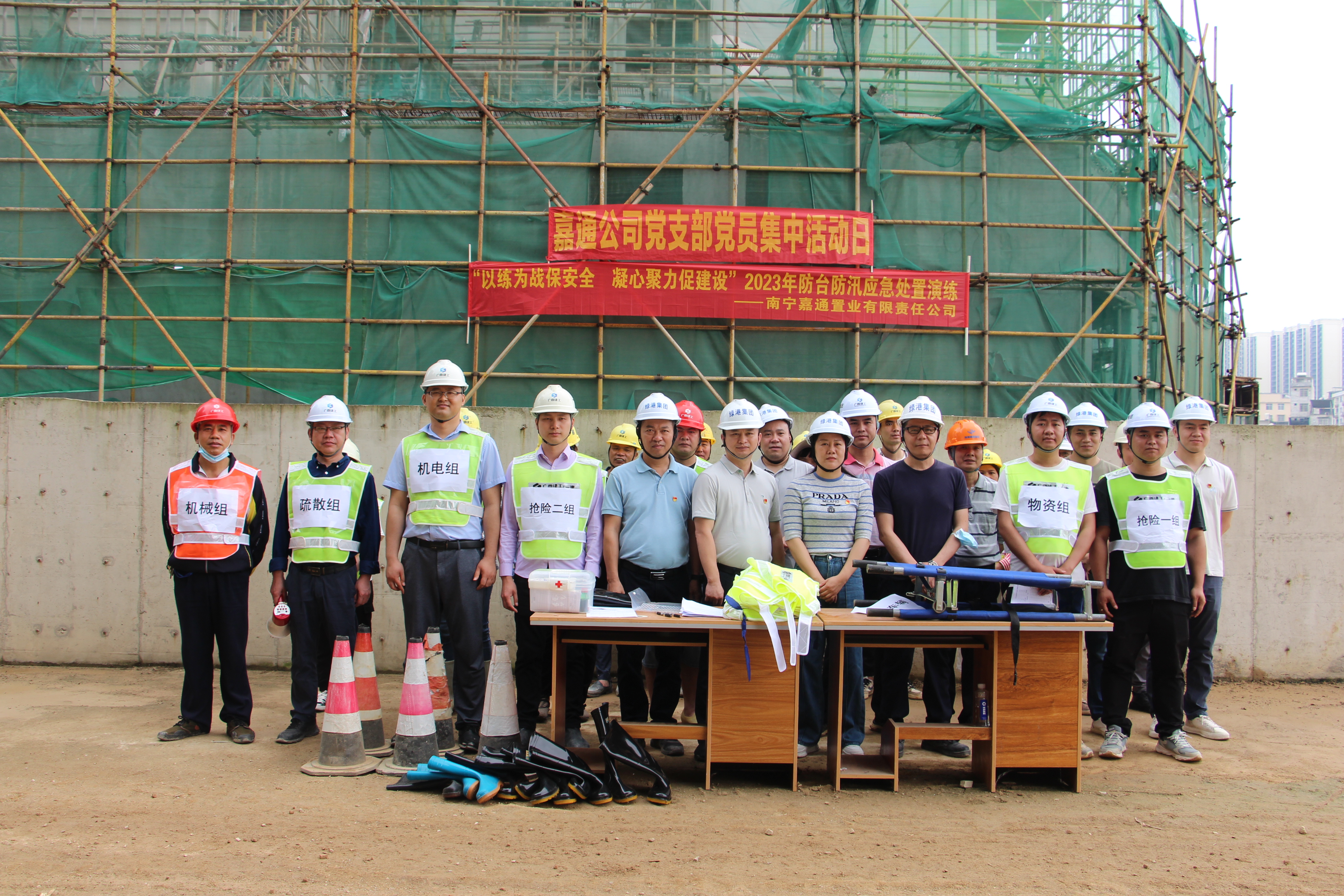 為進(jìn)一步提升項(xiàng)目管理人員應(yīng)對汛情的應(yīng)急處置能力,提高員工防臺防汛的安全意識,保障項(xiàng)目現(xiàn)場的設(shè)備和人身財(cái)產(chǎn)安全,4月19日,嘉通公司聯(lián)合施工單位廣西建工第一建筑工程集團(tuán)有限公司在綠港·尚尊一品項(xiàng)目現(xiàn)場開展“以練為戰(zhàn)保安全 凝心聚力促建設(shè)”2023年防臺防汛應(yīng)急處置演練,全面筑牢安全生產(chǎn)防線。綠港集團(tuán)安全監(jiān)督部、項(xiàng)目負(fù)責(zé)人、業(yè)主代表及一線施工人員約30人參加本次活動(dòng)。集團(tuán)黨委委員、副總經(jīng)理黃麗琴到現(xiàn)場觀摩指導(dǎo)并作防臺防汛工作部署。嘉通公司黨支部書記、總經(jīng)理何小勇在演練前致辭。