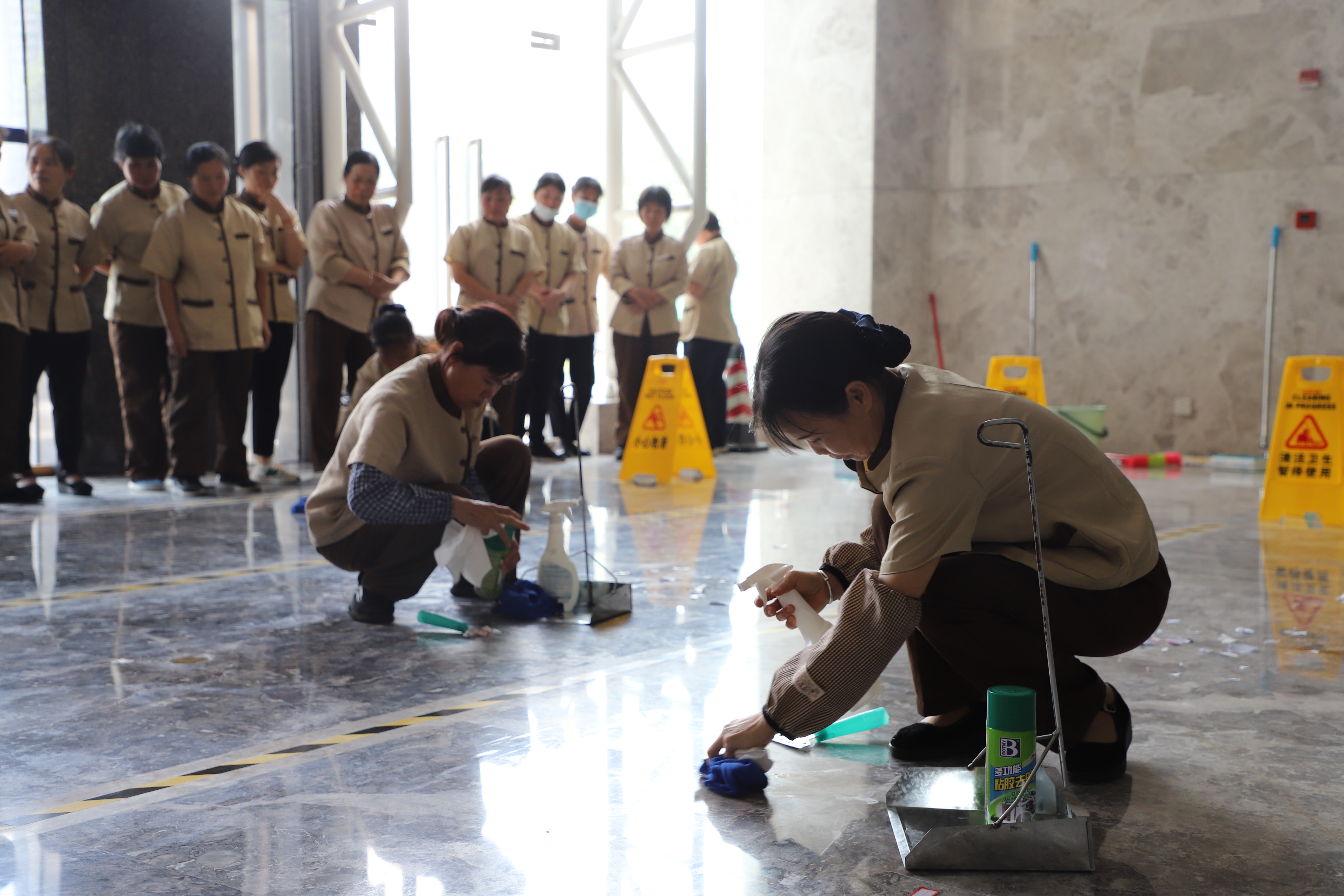 在她們的一雙巧手下地板煥然一新,充分展現(xiàn)了萬(wàn)方保潔人員的專(zhuān)業(yè)風(fēng)采。